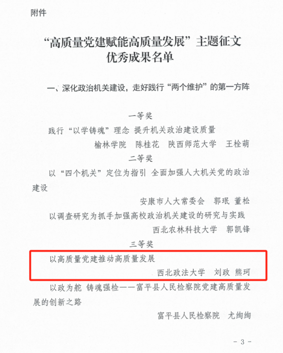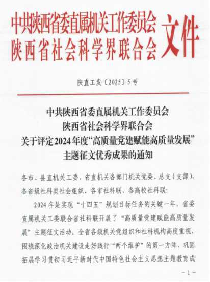 近日,中共陕⻄省委直属机关⼯作委员会、陕⻄省社会科学界联合会发布了2024年度“⾼质量党建赋能⾼质量发展”主题征⽂优秀成果的通知,MX动漫 刘政、熊珂两位老师合著文章《以高质量党建推动高质量发展》荣获三等奖。