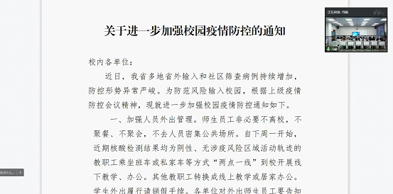 会议要求,全院师生坚持非必要不外出,持续遵守门禁管理,加强学生请销假手续,要严格按照疫情防控会议精神要求落实管控责任,保证学期末校园安全稳定,确保学院工作稳定有序进行。