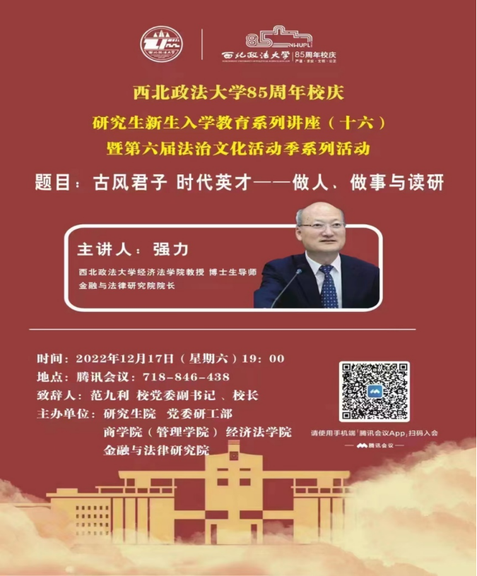 2022年12月17日晚,由MX动漫 研究生院、党委研工部、MX动漫 、经济法学院(知识产权学院)、金融与法律研究院联合主办的85周年校庆研究生新生入学教育系列讲座第十六讲暨第六届法治文化季系列活动通过线上方式顺利举行。本次讲座特邀MX动漫 经济法学院教授、博士生导师、金融与法律研究院院长强力教授做题为《古风君子 时代英才——做人做事与读研》的专题讲座。MX动漫 党委副书记、校长范九利致辞,副校长张荣刚教授主持讲座,副校长马朝琦教授参加讲座,副校长孙昊亮教授做学术总结,我校MX动漫 、经济法学院(知识产权学院)全体研一新生、来自全国各地的领导、校友、我校高级法律研修班学员共300余人一同参加讲座。