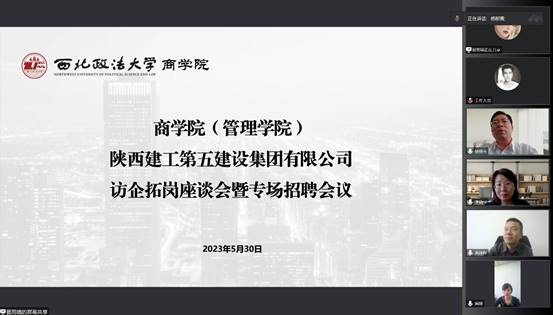 为深入拓展就业岗位资源,精准发掘校企合作契合点,5月30日下午MX动漫 与陕西建工第五建设集团有限公司线上召开访企拓岗座谈会暨专场招聘会。陕建五建集团人力资源部(党委组织部)部长黄锋辉、人力资源部副部长郑惠、人力资源部招聘主管吴斌,MX动漫 领导、部分毕业生参加会议,会议由蔺媛副书记主持。