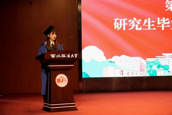 研究生毕业生代表赵知非发言。她代表研究生毕业生向学院全体教师的培养致谢,表示将继续保持青春奋斗,持续关注学校、学院事业发展,用激扬青春收获人生成长。