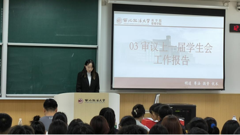 ▲第九届学生会主席团代表范雨洁做工作报告