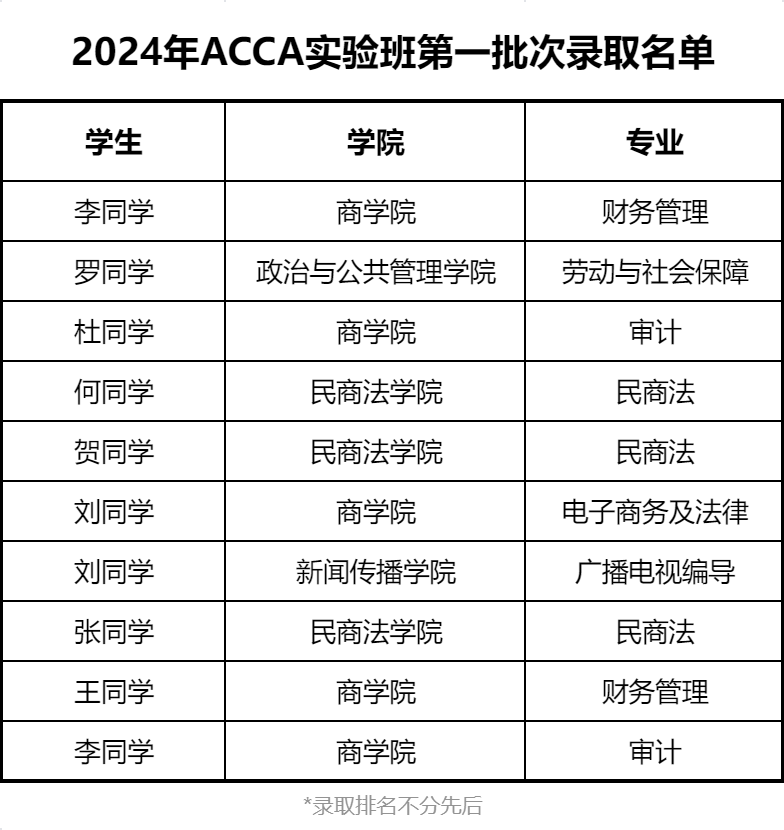 (管理学院)ACCA实验班2024年度第一批次录取结束,现公布录取名单如下。