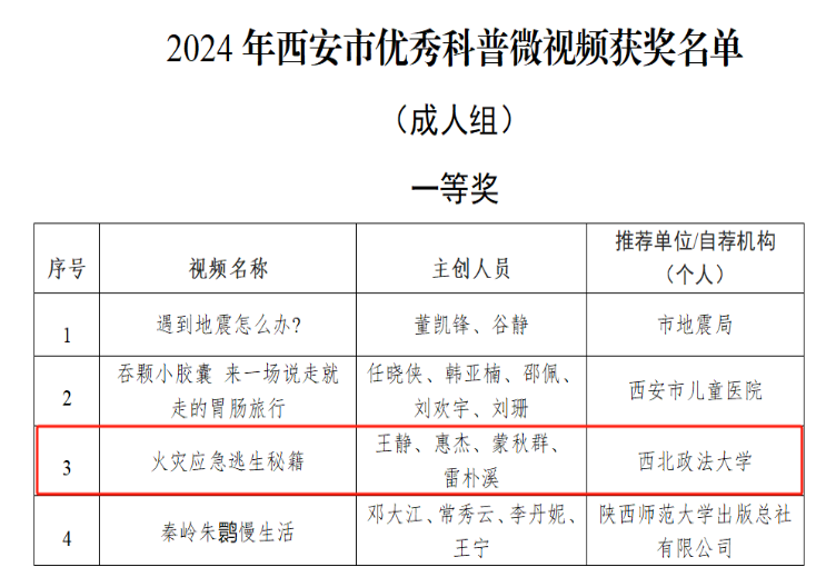 王静教授和应急管理专业的硕士研究生惠杰、蒙秋群、雷朴溪组成的团队共同制作的科普微视频作品《火灾应急逃生秘籍》脱颖而出,荣获“2024年西安市优秀科普作品”一等奖。这是继2023年10月王静教授和研究生团队作品《遇到暴雨、洪涝我们应该怎么做?》荣获“2023年陕西省优秀科普作品”优秀奖后,再次荣膺获奖。