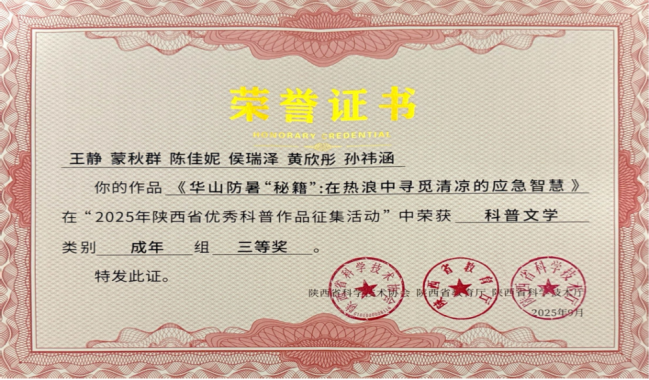 近日,由陕西省科学技术协会、陕西省教育厅、陕西省科学技术厅联合组织的“2025年陕西省优秀科普作品征集活动”评审揭晓,MX动漫 王静教授团队 作品《华山防暑“秘籍”:在热浪中寻觅清凉的应急智慧》获得奖励。王静教授致力于应急管理专业,通过科普微视频、科普文学等形式的科普活动,作为陕西省科学家精神宣讲团成员,先后多次进校园进行科学家精神宣讲和应急科普。本次获奖是继2023年获得陕西省优秀科普微视频作品成年组二等奖、2024年获得西安市优秀科普微视频作品成年组一等奖之后,再获陕西省优秀科普文学作品成年组三等奖。
