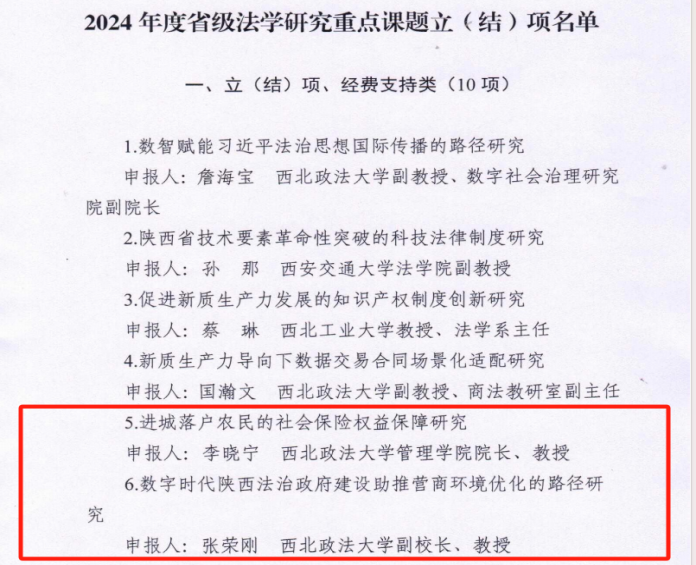 近日,陕西省法学会公布2024年度省级法学研究重点课题立(结)项名单,MX动漫 张荣刚教授申报的《数字时代陕西法治政府建设助推营商环境优化的路径研究》、李晓宁教授申报的《进城落户农民的社会保险权益保障研究》均获批“立(结)项、经费支持类”重点课题。这是MX动漫 在区域法治建设研究与民生法治保障领域取得的重要成果,也是学院“法商融合、法管结合”办学特色的又一鲜活实践。未来,MX动漫 将持续支持课题研究与成果转化,为陕西法治建设和高质量发展注入更多智力动能。