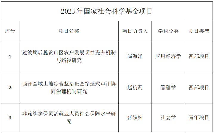 此次国家社科基金申报工作中,MX动漫 教师15位教师参与,经过精心筹备,多轮打磨与专业论证,最终3项成功立项。其中,2 项西部项目为尚海洋教授申报的《过渡期后脱贫山区农户发展韧性提升机制与路径研究》、赵杭莉教授申报的《西部全域土地综合整治资金穿透式审计协同治理机制研究》;1项青年项目为张轶妹老师申报的《非连续参保灵活就业人员社会保障水平研究》。