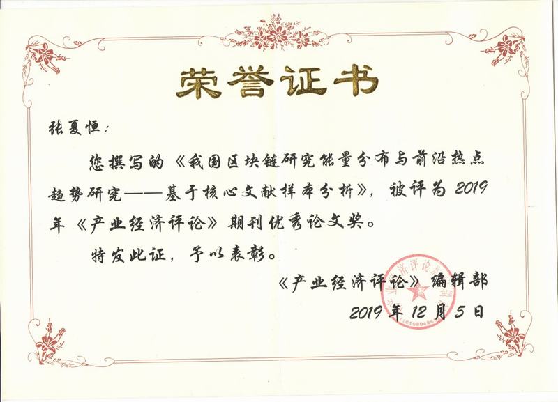 张夏恒副教授发表在《产业经济评论》2019年第2期的文章“我国区块链研究能量分布与前言热点趋势研究——基于核心文献样本分析”获得年度优秀论文奖,并在年会现场颁奖。