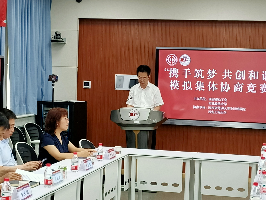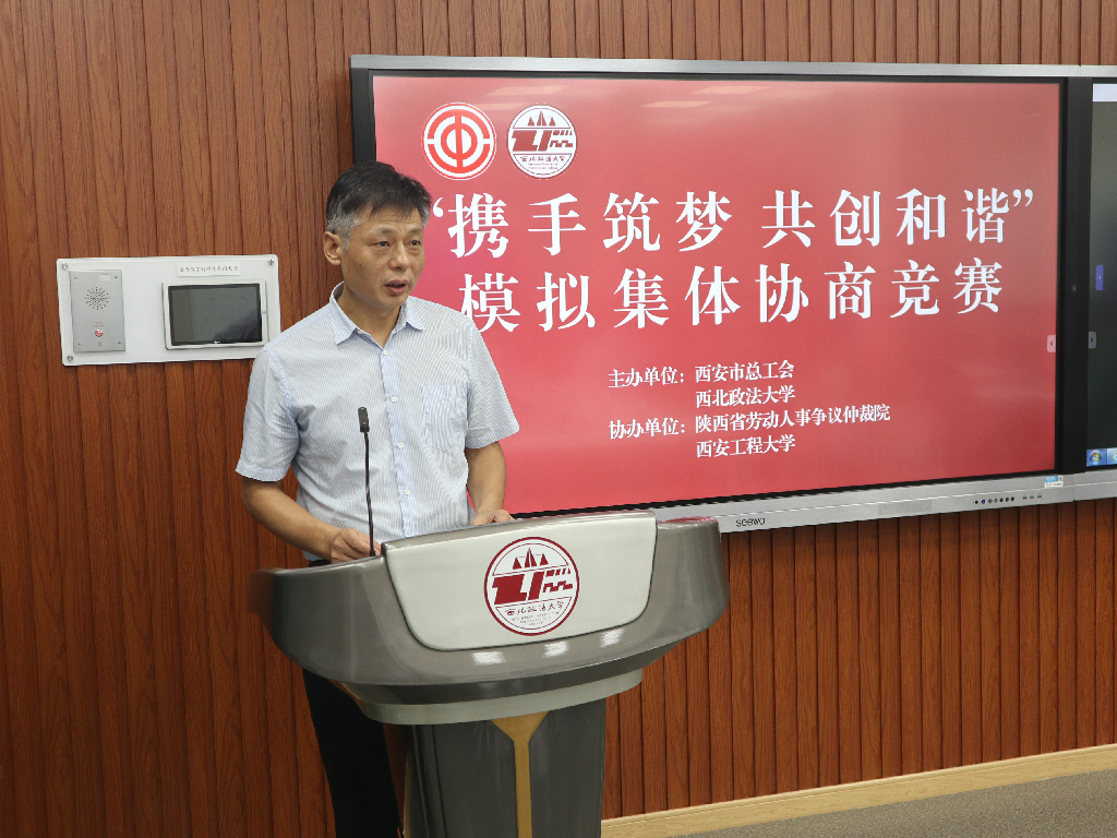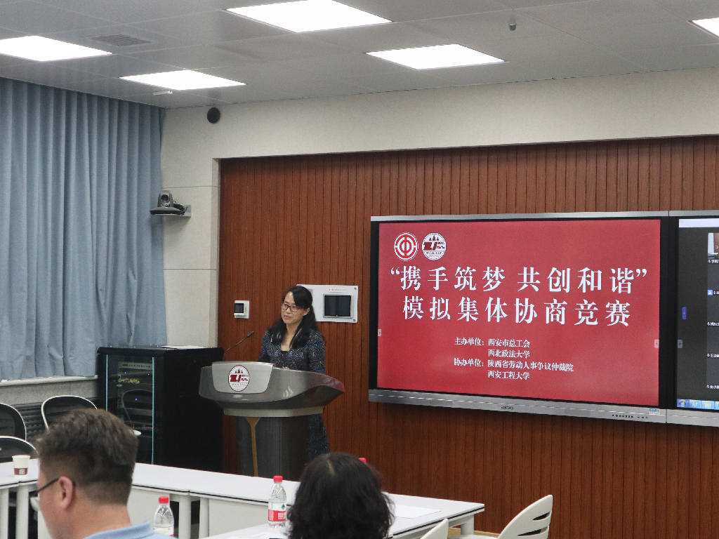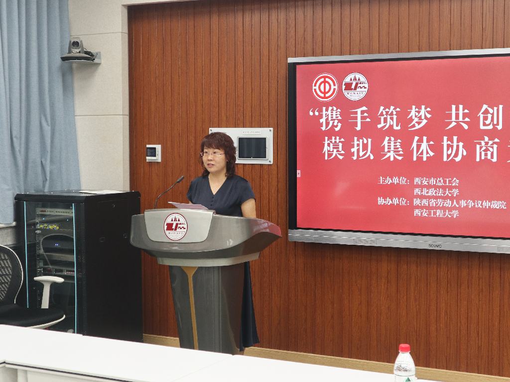 西安工程大学管理学院院长李艳致辞,她表示共同举办模拟集体协商竞赛,对于加强高校之间以及高校与市总工会的交流探讨,践行集体协商理念具有积极的意义。