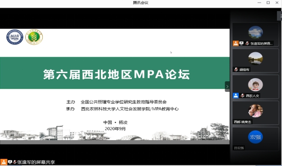 9月19日,由MPA教指委主办、西北农林科技大学承办的西北地区MPA论坛依托腾讯会议线上召开。来自包括西安交通大学、兰州大学、西北农林科技大学等在内的共计89人参加论坛。
