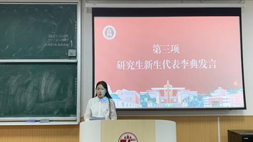2023级社会保障专业研究生李典代表新生发言,她回顾了考研期间艰苦奋斗的时光,并表示要找准目标,努力培养自主学习、独立思考的习惯,保持乐观心态,静心开展研究,不辜负学校和老师的培养和期望。