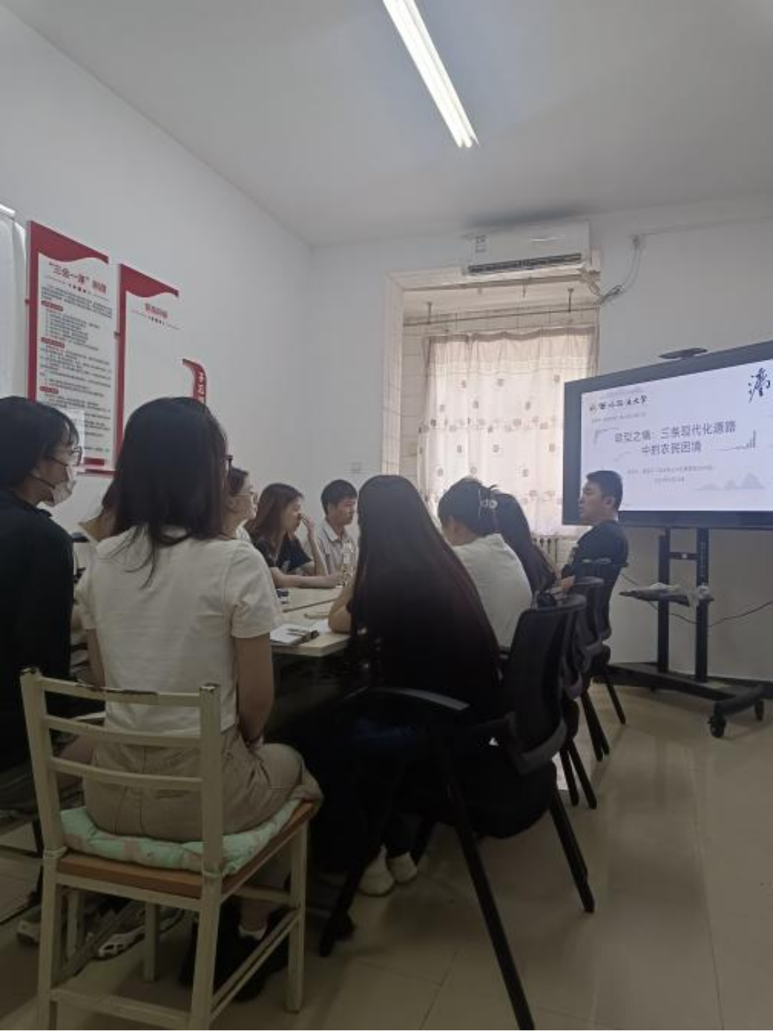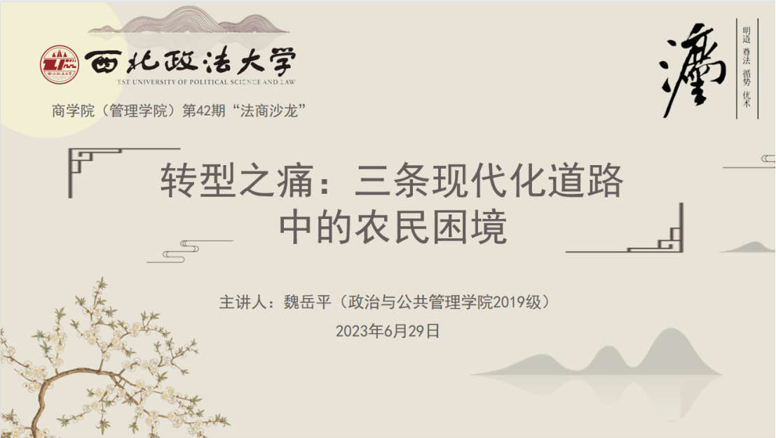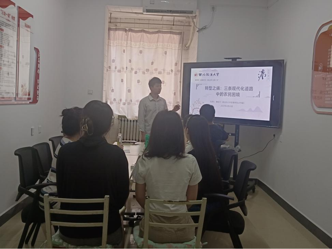 2023年6月29日上午,MX动漫 (管理学院)第42期“法商沙龙”在南校区7号学生公寓“一站式”社区工作站104室如期举行。政管学院2019级本科生魏岳平带来题为“转型之痛:三条现代化道路中的农民困境”的读书报告,李章星老师担任沙龙评议人,10余名本科生和研究生参与沙龙讨论。