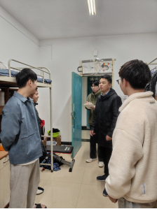 与此同时,各辅导员老师对寝室设施损坏等情况进行登记和上报维修,并叮嘱同学们要保持良好的卫生状况,仔细排查安全隐患,做到人走断电等要求。殷殷关怀,暖人心田。在走访活动的最后,赵参书记对各位同学提出期待,希望同学们以更加积极饱满的精神状态投入到学习生活中,为即将到来的期末考试做准备。