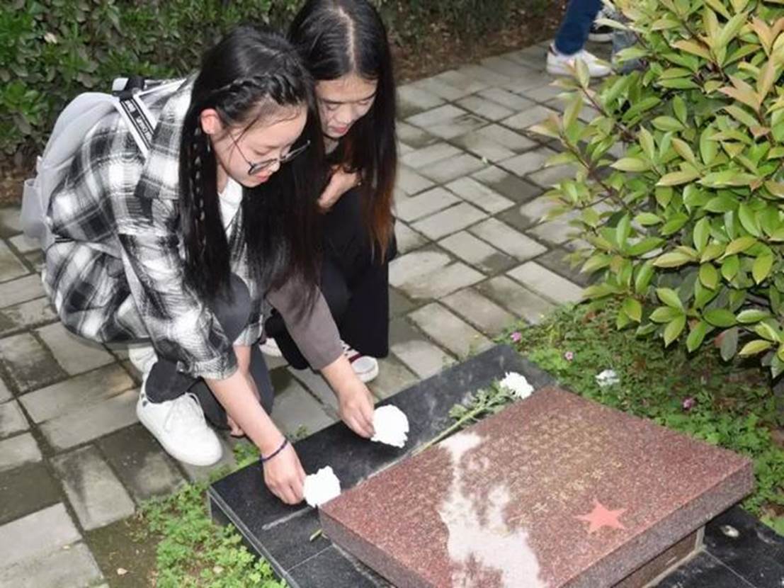 下午13时30分,全体团员到达目的地,在门口整理仪容仪表、分发祭献花束后整齐列队进入烈士陵园。