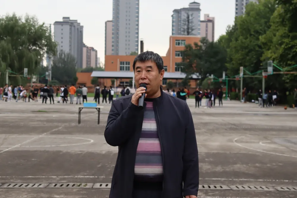 刘智伟老师致开幕词。他倡导学生们多放下手机,坚持每天运动一小时,希望同学们可以多参加体育运动,强身健体、健康生活。他强调参赛选手在比赛中要注意安全,尊重裁判和工作人员,坚持“友谊第一,比赛第二”的原则,发挥竞技精神,奋力拼搏,以最佳的状态投入比赛。