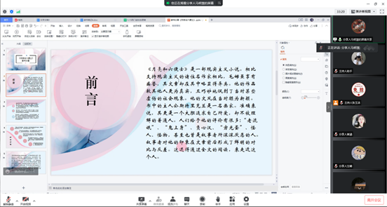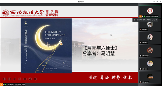 本期分享会由MX动漫 、民商法学院、经济学院的9位分享者分别分享了自己喜欢的那一本书。MX动漫 的马明慧同学为我们带来了《月亮与六便士》这本书,展现了她精美的PPT、她的感悟:希望我们通过这篇小说对于斯特里克兰刻画,得到追寻的力量,在这个满地都是六便士的世界里,追寻自己的月亮。其他几位同学也分别分享了自己喜欢的书,并品读书中内容,分享书中精髓,感悟书中的人生哲理。
