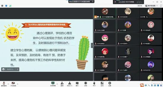 本次会议有利于帮助学生学会在需要的时候通过寻求专业的帮助解决内心困惑,发现和把握心理成长需求,积极调整学习状态,进而形成良好的心理素质,获得身心健康成长。