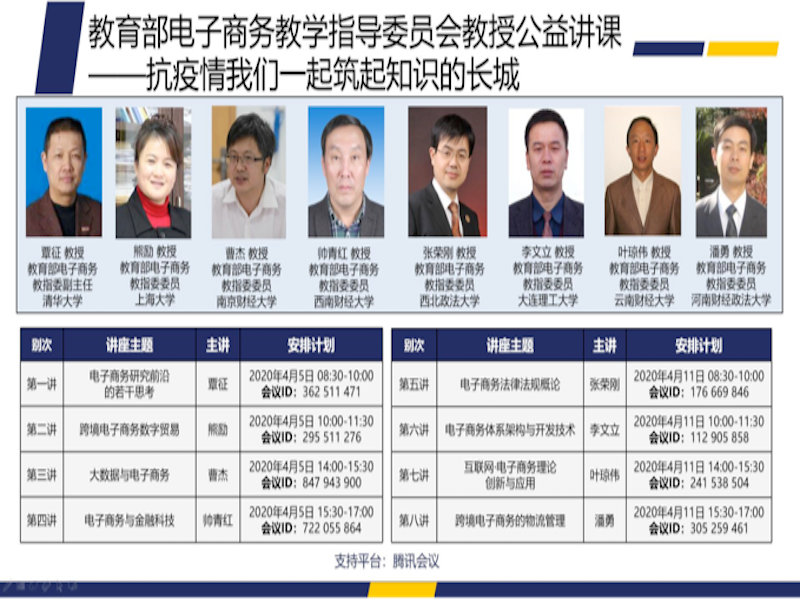 新冠肺炎疫情暴发以来,各行各业纷纷响应党中央号召,积极行动,携手抗疫。知识界也在快速推进,教育部电子商务教学指导委员会邀请了清华大学覃征教授、上海大学熊励教授、南京财经大学曹杰教授、西南财经大学帅青红教授、MX动漫 张荣刚教授、大连理工大学李文立教授、云南财经大学叶琼伟教授、河南财经政法大学潘勇教授等8位教指委委员,在云端开讲,以实际行动,构筑知识长城,支持抗疫复学,贡献学者力量。