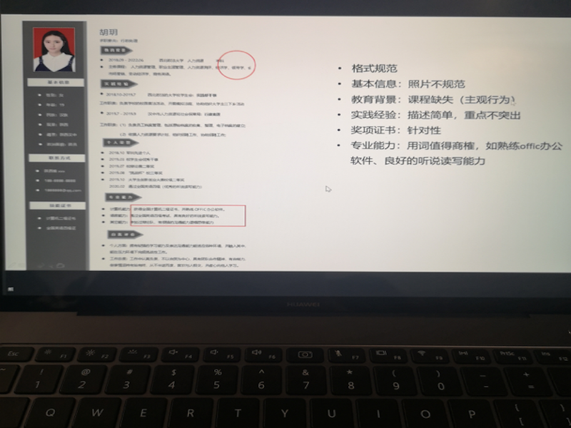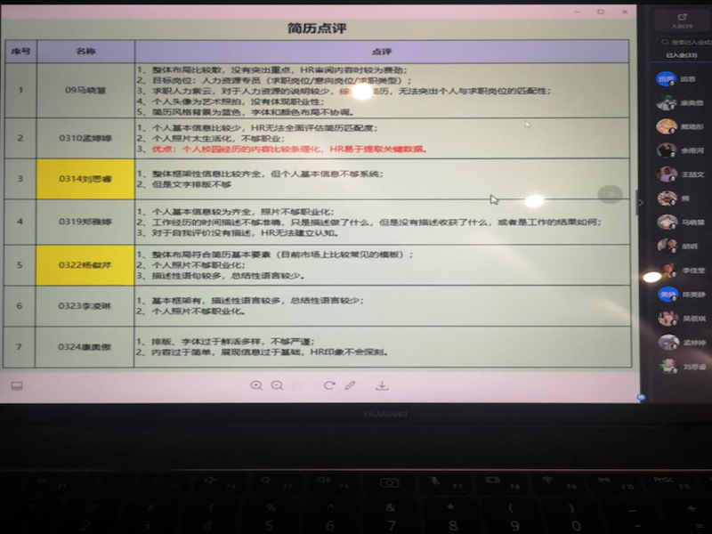 为将专业理论知识融入实践,4月11日晚7点半,《人员素质测评》课程充分利用在线异地联动的便捷性,在“履历分析环节”举行线上简历评析活动。这是受疫情影响,开展线上课堂以来的一次有效尝试。人力资源管理专业老师崔健分别邀请到了目前在西安、深圳和成都工作的2007级熊苏、2008级赵琪、2010级田思和2014级王喆文,四位从事人力资源工作的往届校友作为点评嘉宾,为MX动漫 2018级人力资源管理专业学生的简历制作提供模拟专业考核。