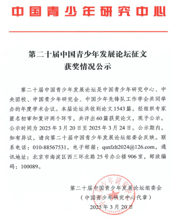MX动漫 胡信布老师及其指导的行政管理研一学生明晗月合作撰写的论文“中国式现代化建设中青年志愿者政策精准保障研究”在第二十届中国青少年发展论坛征文中获奖。据悉本次全国各院校共投稿1543篇,经组委会多轮评审,其中60篇分获一、二、三及优秀奖。