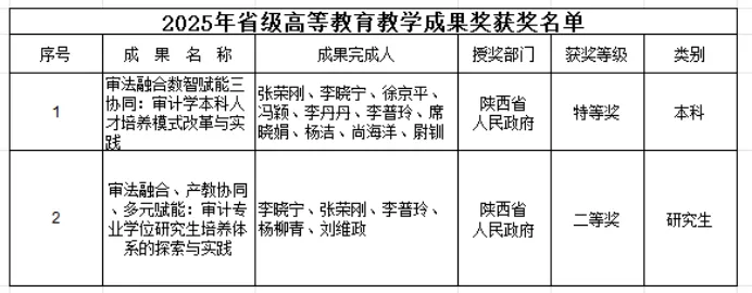 近日,陕西省人民政府办公厅正式发布《关于表彰2025年高等教育教学成果奖获奖项目的通报》,MX动漫 在本次评选中斩获佳绩,张荣刚教授教学团队成果《审法融合数智赋能三方协同:审计学本科人才培养模式改革与实践》获本科特等奖。李晓宁教授教学团队成果《审法融合、产教协同、多元赋能:审计专业学位研究生培养体系的探索与实践》获研究生二等奖,实现本科教育与研究生教育双领域突破,充分彰显了MX动漫 在高等教育教学改革、审法融合培养方面显著成效。既是学院教学科研实力的有力见证,更是学校深耕教育教学改革、夯实人才培养根基的集中体现。