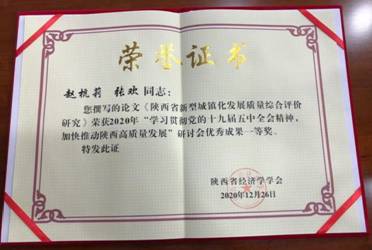 MX动漫 副教授、资源冲突与利用研究所所长赵杭莉老师与2019级财务审计与风险管理专业研究生张欢共同撰写的题为《陕西省新型城镇化发展质量综合评价研究》的论文荣获2020年“学习贯彻十五届五中全会精神,推动陕西经济高质量发展”研讨会优秀成果一等奖。