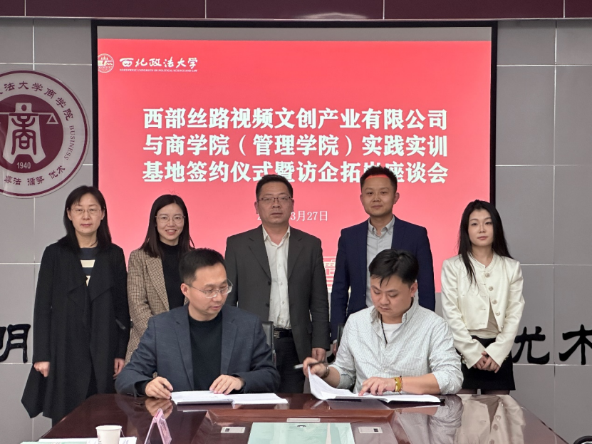 (管理学院)与西部丝路视频文创产业有限公司于诚意楼617举行教学实践实训基地签约授牌仪式。西部丝路视频文创产业有限公司执行董事廖琰、总经理郭春虤、董事助理管森,MX动漫